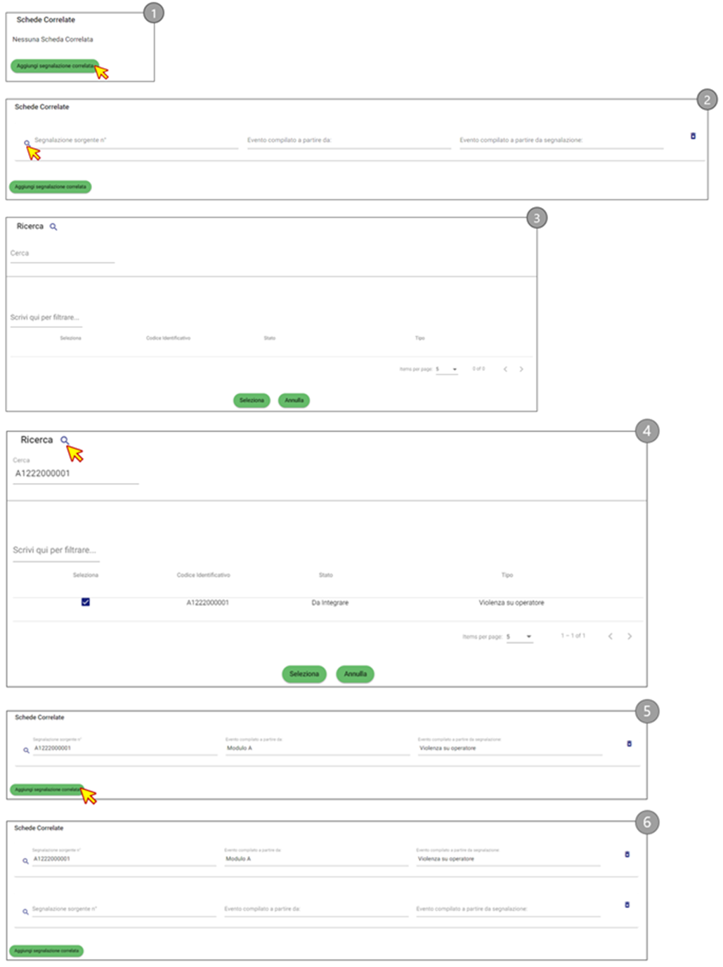 Alcuni eventi richiedono di essere descritti mediante l’inserimento di più schede. Ad esempio, un episodio di violenza sull’operatore che vede coinvolti più operatori, deve essere descritto inserendo una segnalazione per ciascun operatore coinvolto. Ognuna di queste segnalazioni, dal momento che riguarda lo stesso evento, deve essere correlata alle altre.