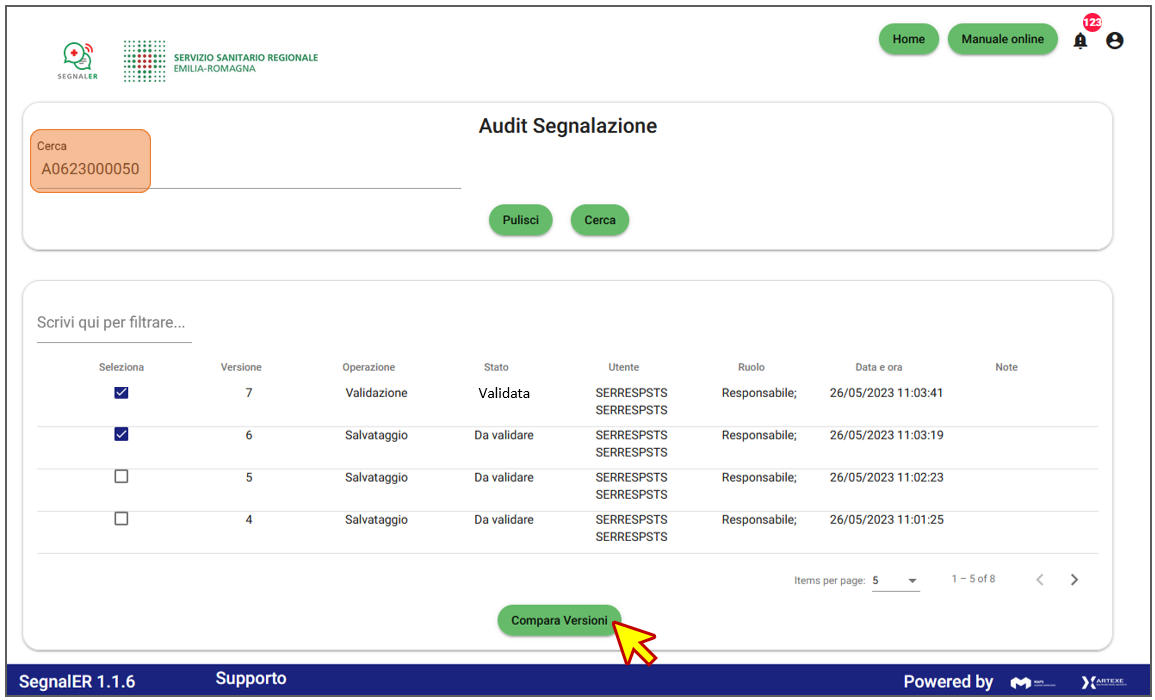Nella lista dei risultati, il sistema mostra tutte le versioni disponibili della segnalazione, corrispondenti ad ogni salvataggio effettuato. Di default, il sistema seleziona l'ultima e la penultima versione per eseguire il confronto, ma l'utente può modificare la scelta selezionando le versioni di interesse.