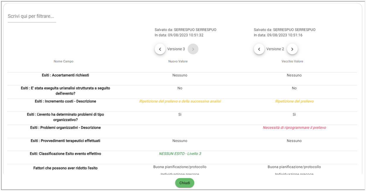 Il sistema mostra una schermata dove viene effettuato il confronto tra i campi delle due versioni selezionate. E' possibile utilizzare il campo Scrivi qui per filtrare per effettuare una ricerca su tutte le colonne mostrate.Nelle colonne Nuovo Valore e Vecchio Valore, è indicato l'utente che ha eseguito il salvataggio/l'operazione e la data e ora del salvataggio. Mediante le frecce è possibile spostarsi su una versione più vecchia o più recente della segnalazione. Le frecce risulteranno disabilitate, qualora non esista una versione precedente o successiva rispetto a quella mostrata.