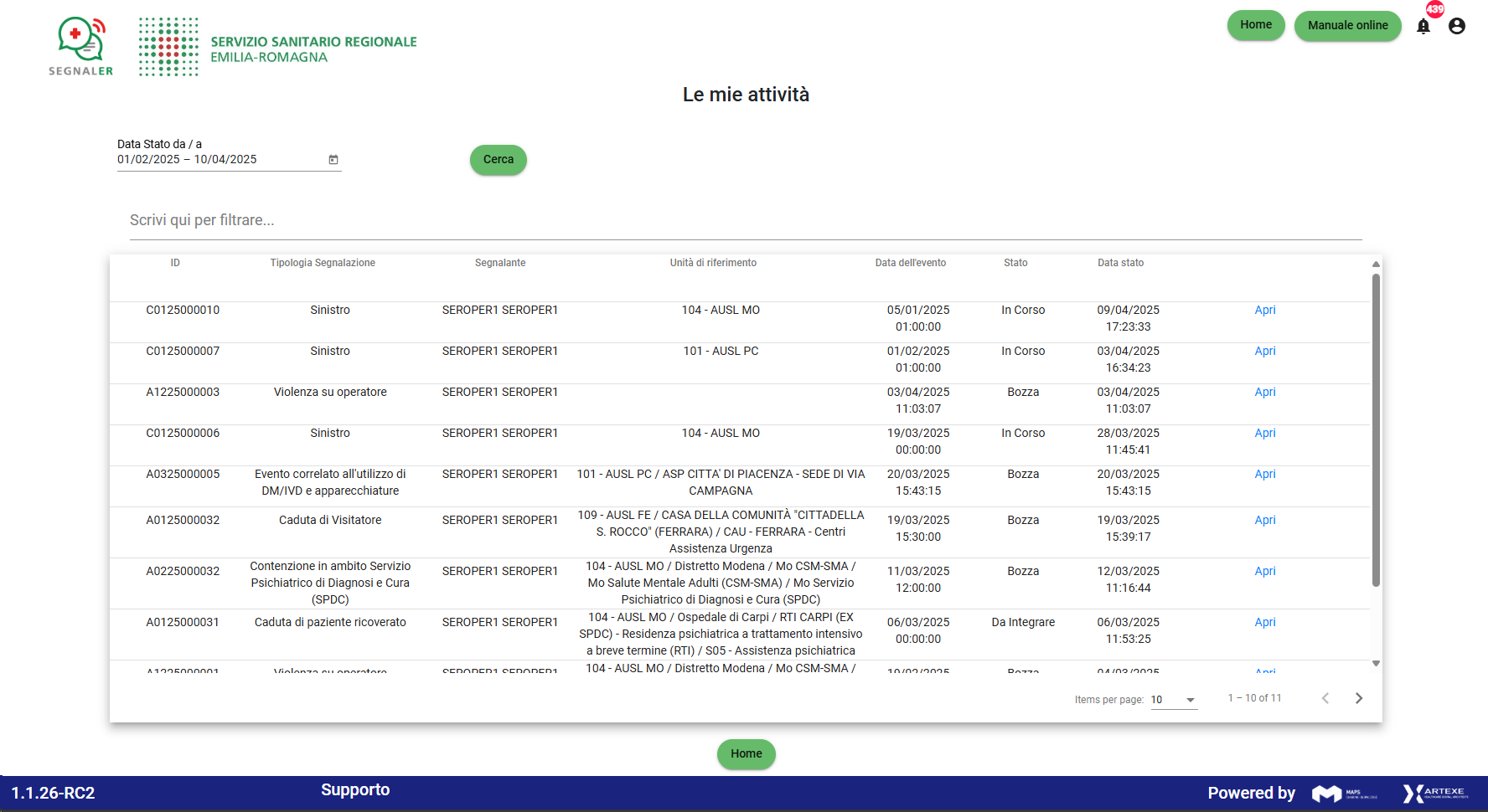 Nell'applicativo, le attività di un utente sono rappresentate dalla lista di segnalazioni su cui può svolgere operazioni, accessibile dalla pagina principale premendo il pulsante Le mie attività.
