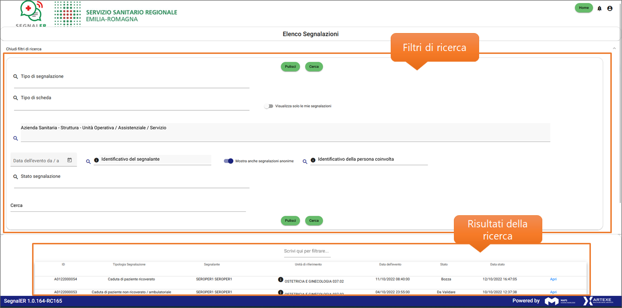 Da questa schermata, l’utente può eseguire una ricerca mediante alcuni filtri e consultare i risultati della ricerca, come descritto di seguito.