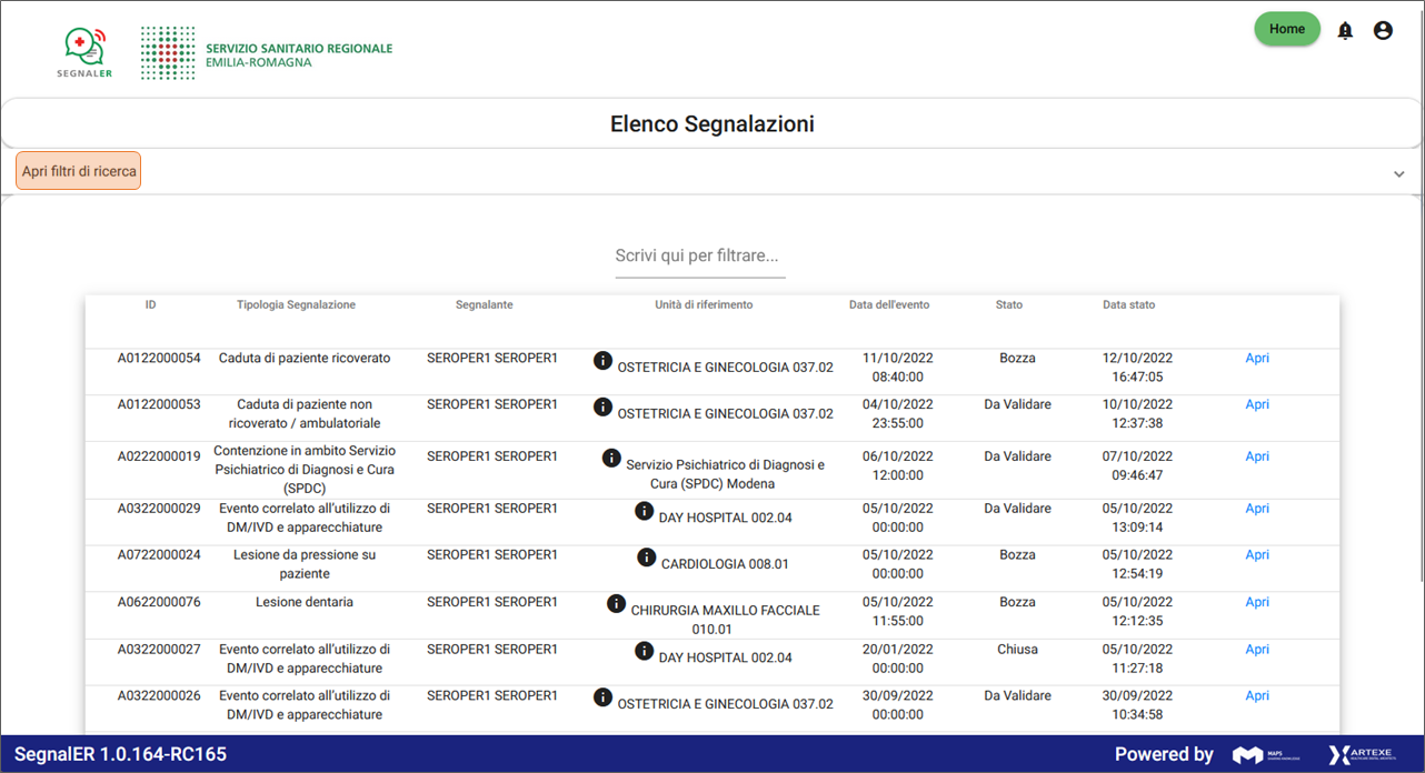Dopo aver premuto il pulsante Elenco segnalazioni della homepage, si apre la schermata Elenco segnalazioni.