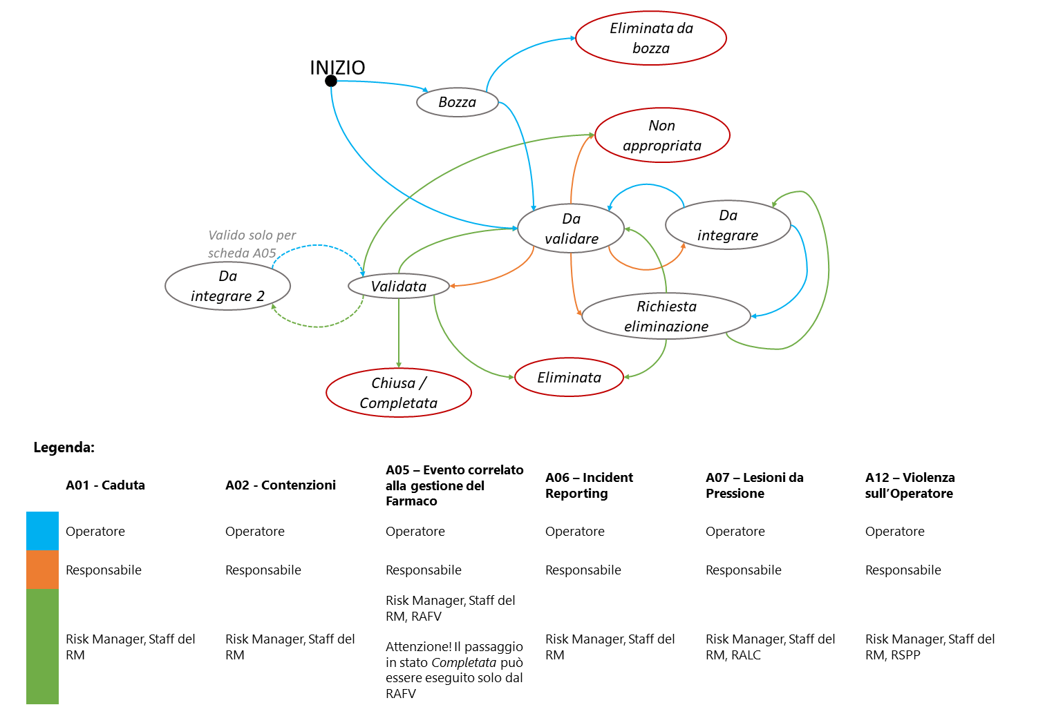 Schede A01-Caduta, A02-Contenzioni, A05-Evento correlato alla gestione del Farmaco, A06-Incident Reporting, A07-Lesioni da Pressione, A12-Violenza sull'Operatore