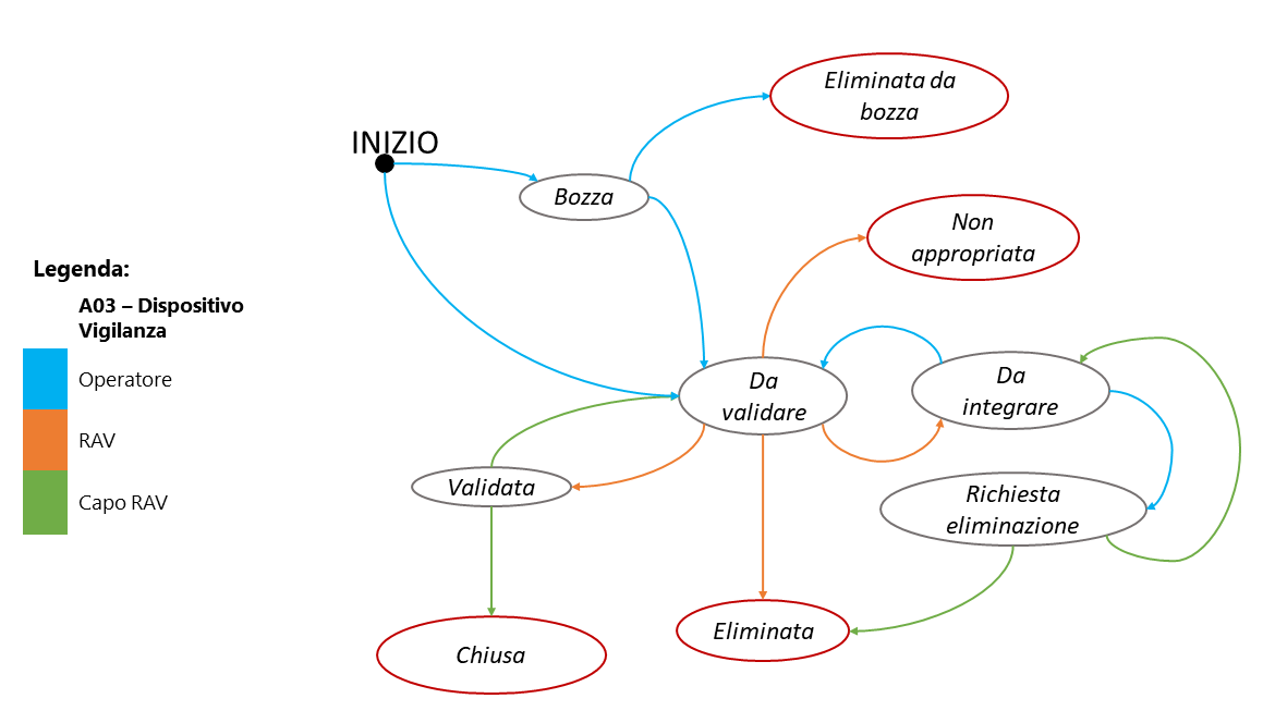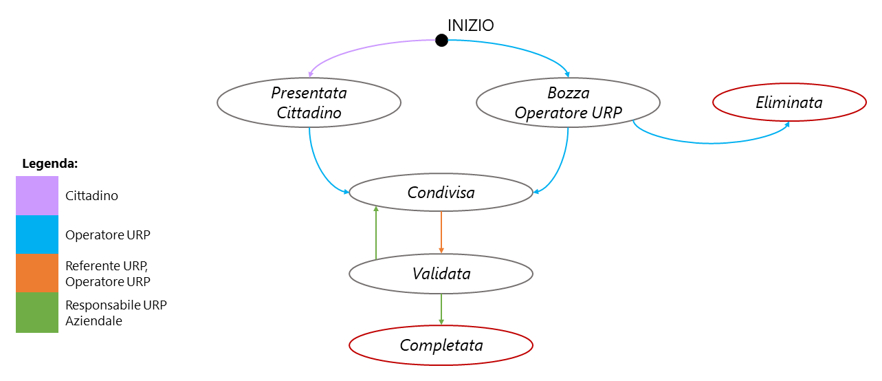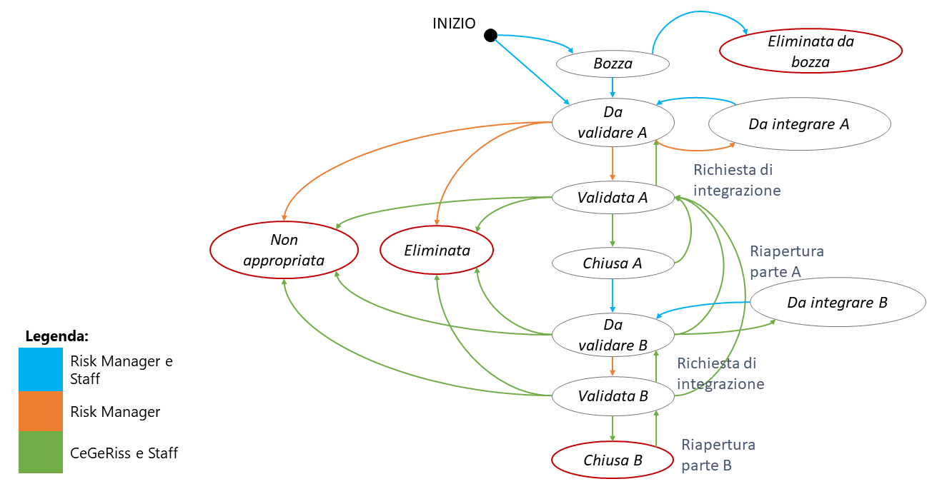 Di seguito sono riportati i diagrammi degli stati delle schede, con una legenda per spiegare il codice colore utilizzato nei diagrammi, che rappresenta quali ruoli applicativi effettuano l'operazione che causa il passaggio di stato.