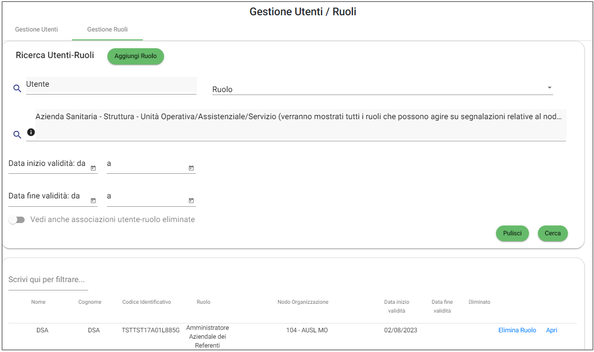 • Data inizio validità e Data fine validità permettono di selezionare dei range di date che contengono il periodo di validità di un ruolo associato ad un utente.