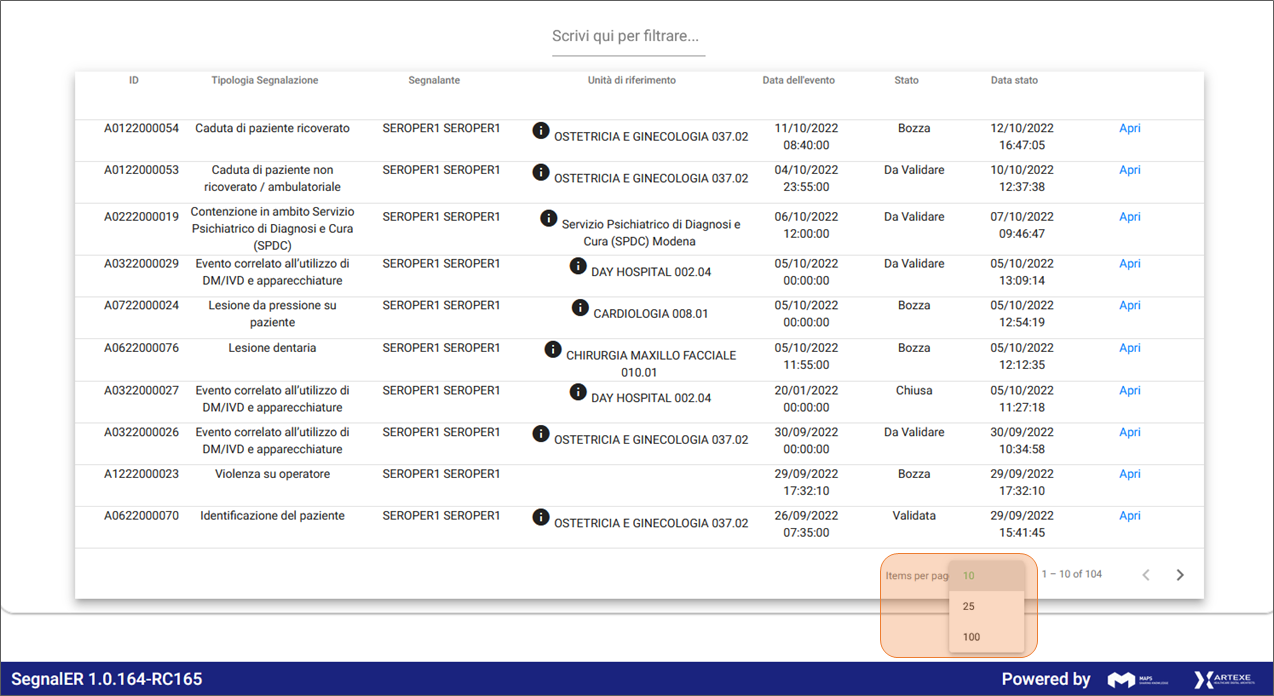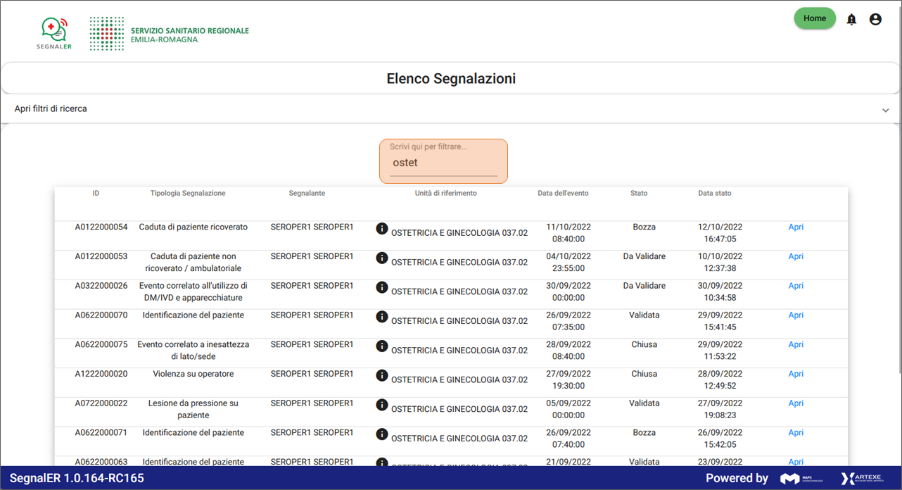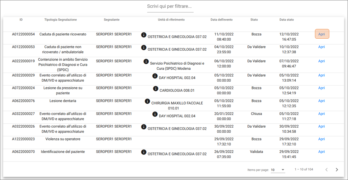 Dopo aver eseguito una ricerca, dalla lista dei risultati è possibile aprire una segnalazione premendo su Apri: il sistema reindirizza l’utente alla segnalazione scelta.