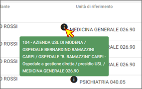 Il simbolo indica la presenza di un tooltip: posizionando il puntatore sull’icona, senza cliccare, compare un breve messaggio a comparsa che fornisce informazioni aggiuntive. In questo caso, viene mostrato l’intero percorso all’interno dell’Organizzazione delle Strutture Sanitarie.