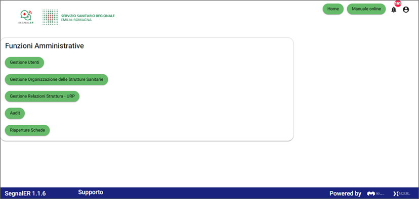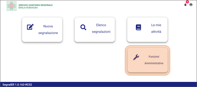 Gli utenti provvisti dei ruoli amministrativi, nella schermata principale dell’applicativo, vedono il pulsante Funzioni Amministrative.