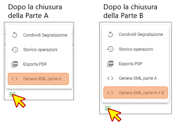 Dopo la chiusura della Parte B della segnalazione, l'utente può decidere se generare l'XML esclusivamente della Parte A oppure se generare l'XML di tutta la scheda (Parte A+B).