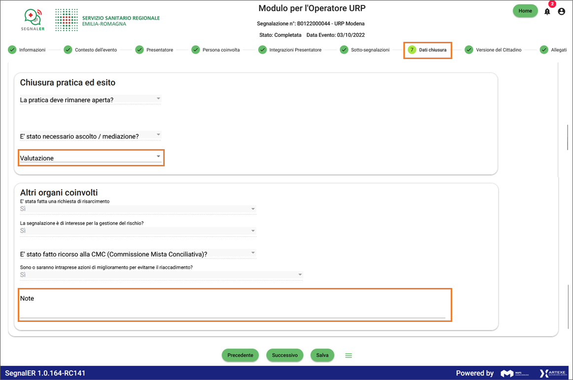 • Valutazione della sezione Dati Chiusura, area Chiusura pratica ed esito
