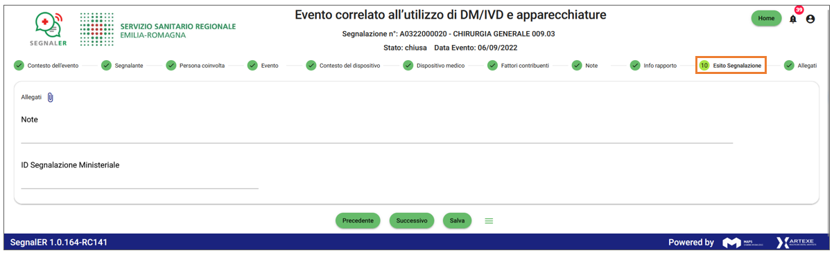 Lo step Esito della segnalazione rimane compilabile soltanto da parte degli utenti con ruolo di RAV e Capo RAV, anche dopo la conclusione del processo di segnalazione (stato della segnalazione = Chiusa).