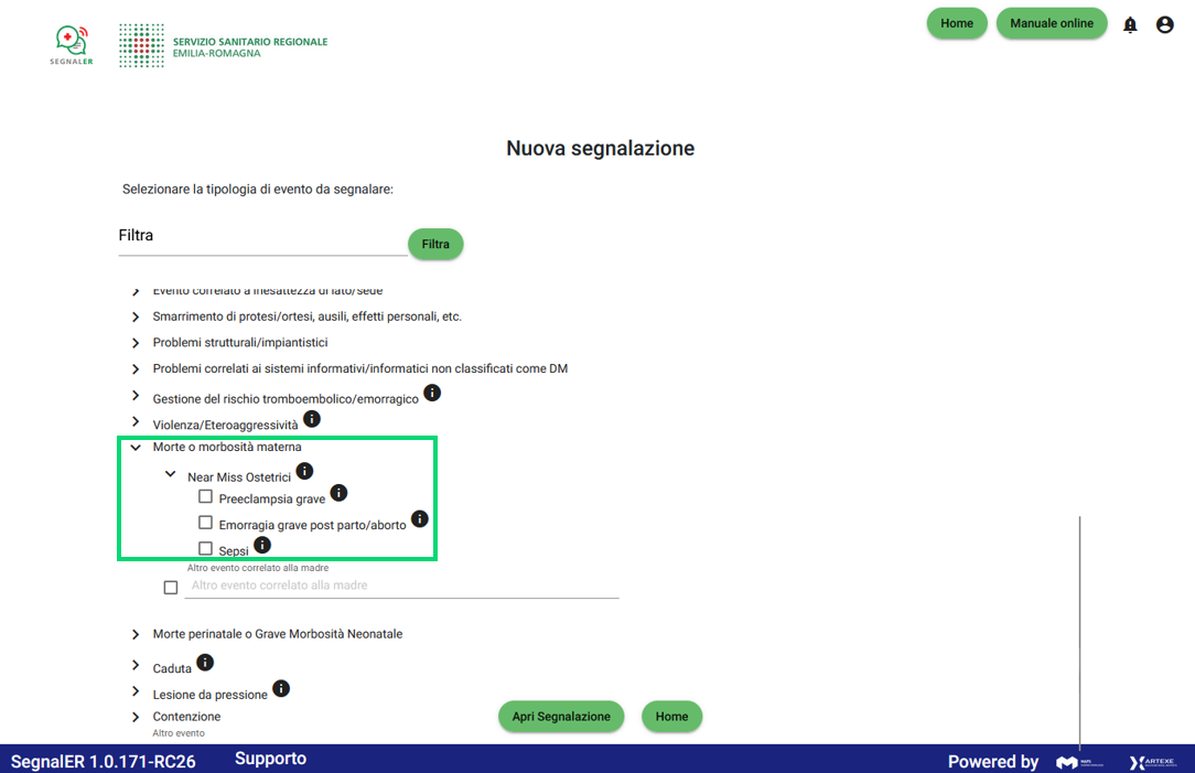 Attenzione! La segnalazione di Near Miss Ostetrici può essere inserita soltanto da utenti che possiedono il ruolo di Referente Near Miss Ostetrici. Solamente essi vedranno nella lista di apertura le voci "Preeclampsia grave", "Emorragia grave post parto/aborto" e "Sepsi" relative ai Near Miss Ostetrici.