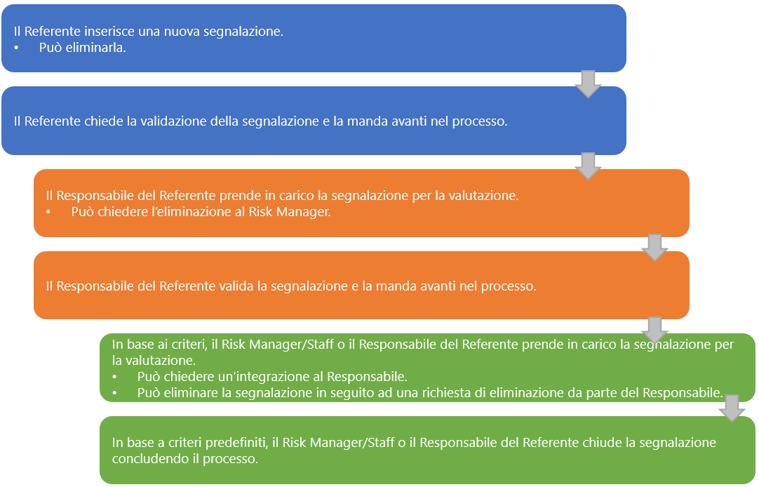 Il diagramma in figura descrive le operazioni che gli utenti possono eseguire sulla segnalazione in base al ruolo che rivestono e alla fase del processo.