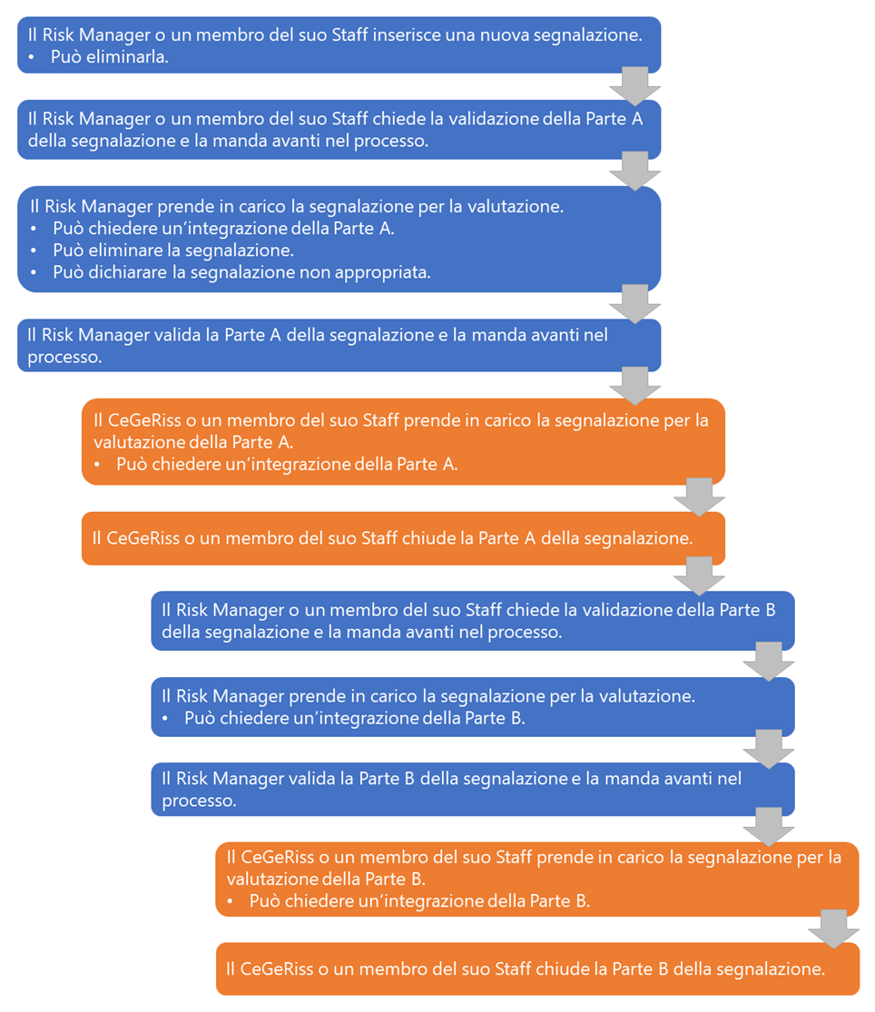 Il diagramma in figura descrive le operazioni che gli utenti possono eseguire sulla segnalazione di Evento Sentinella in base al ruolo che rivestono e alla fase del processo.