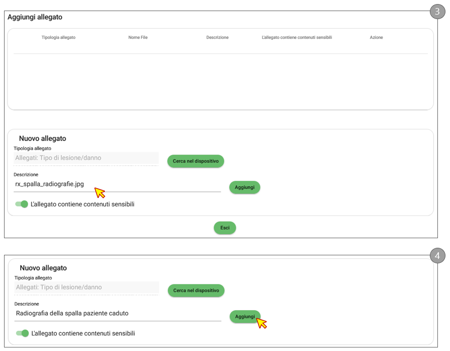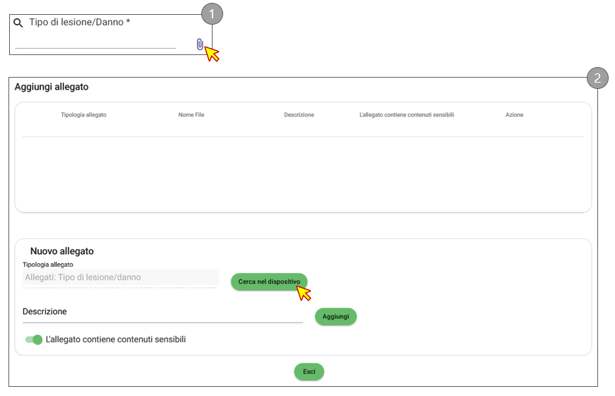 • Il campo Descrizione viene valorizzato con l’etichetta del documento scelto, ma è possibile modificarla. Il nome del documento verrà comunque salvato. Il campo Tipologia di allegato non è modificabile. Il campo L'allegato contiene contenuti sensibili, se attivato, impedisce di scaricare l'allegato agli utenti che non devono vedere i dati sensibili della segnalazione per questioni di privacy.
