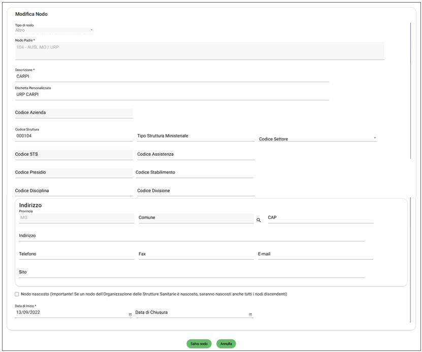 ! Si ricorda che ai nodi dell’Organizzazione delle Strutture Sanitarie sono associati i ruoli degli utenti, quindi, quando si chiude un nodo, è necessario concludere anche la validità della relazione utente-ruolo-nodo.