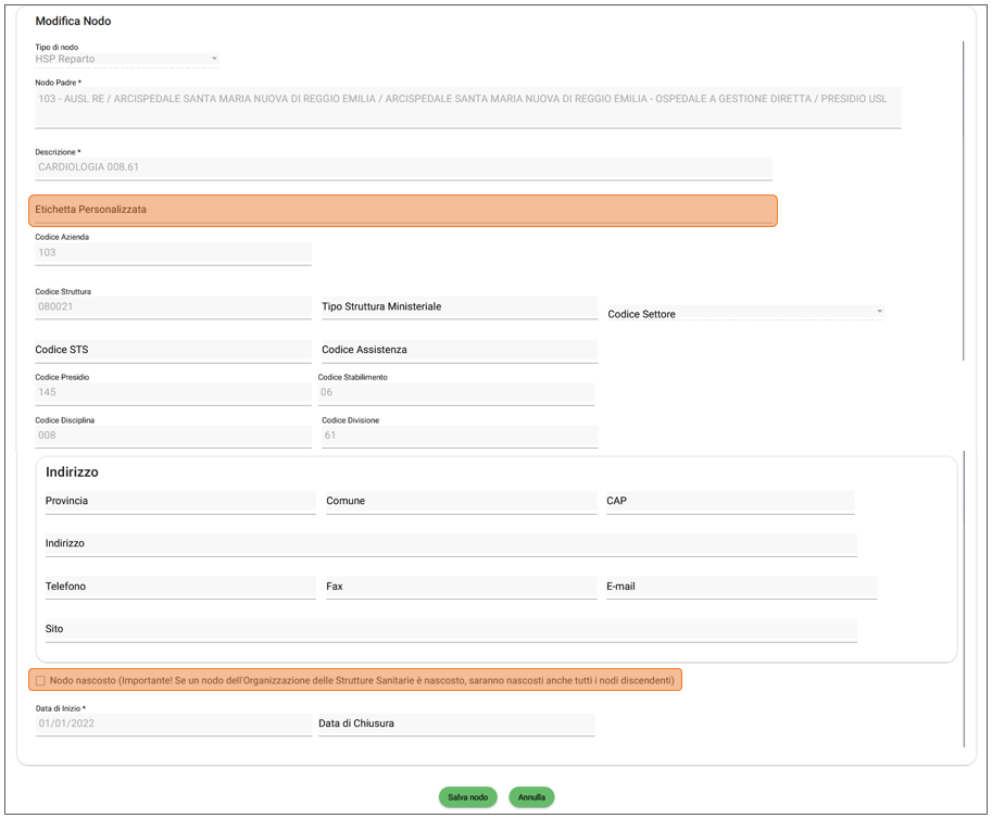 Se il nodo selezionato per la modifica è stato importato dal database regionale, gli unici campi che l’utente può modificare sono