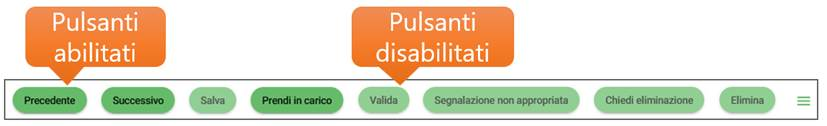 I pulsanti relativi alla modifica dei campi (Salva) e al processo di segnalazione (e.g., Valida, Chiedi eliminazione, Chiedi integrazione, etc.) risultano disabilitati.