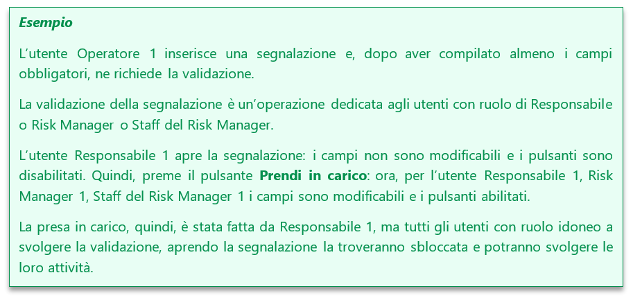 L’azione di presa in carico permette, a tutte le persone che possono compiere operazioni in un determinato stato della segnalazione, di lavorare sulla scheda. Non si tratta di una vera e propria presa in carico da parte di un utente, ma di un’operazione che permette di sbloccare la segnalazione per tutti: dopo la presa in carico, infatti, tutti gli utenti con ruolo idoneo a compilare e compiere operazioni sulla segnalazione in quel determinato stato, possono procedere alla lavorazione.