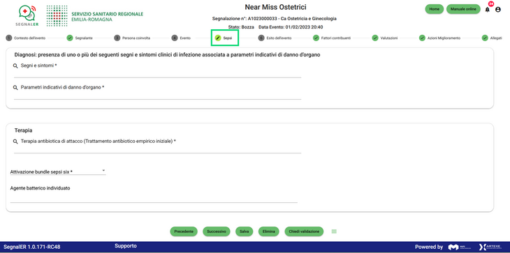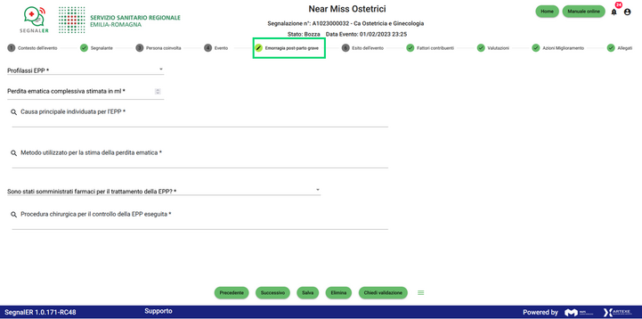 In base all'evento di Near Miss Ostetrico scelto in fase di apertura di una nuova segnalazione, compare uno dei seguenti step che descrivono nel dettaglio l'evento: