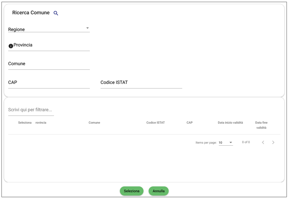 Se non viene compilato alcun campo filtro (Regione, Provincia, Comune, CAP, Codice ISTAT), nella lista dei risultati in basso, verranno restituiti tutti i Comuni del nostro Paese. Per affinare i risultati della ricerca, è sufficiente compilare uno tra i campi filtro e poi premere la lente di ingrandimento.