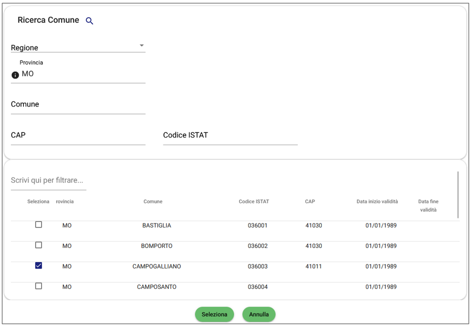 5. Selezionare il Comune desiderato, mettendo la spunta nella casellina a sinistra e premere il pulsante Seleziona.