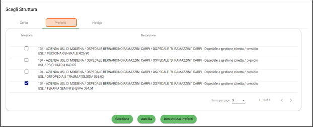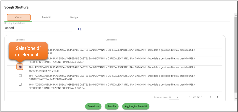 Nella sezione Cerca, compilando il campo Scrivi qui per filtrare con una stringa e premendo sulla lente di ingrandimento, è possibile effettuare una ricerca nell’Organizzazione delle Strutture Sanitarie. In basso sono mostrati i risultati della ricerca. Dopo aver scelto un elemento contrassegnandolo con una spunta, premere il pulsante Aggiungi ai Preferiti per aggiungerlo ai preferiti, oppure premere il pulsante Seleziona.