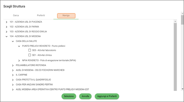 Nella sezione Naviga è disponibile l’intera Organizzazione delle Strutture Sanitarie: premendo sulle frecce a sinistra l’utente può espandere o comprimere i vari nodi. Dopo aver scelto un elemento contrassegnandolo con una spunta, premere il pulsante Aggiungi ai Preferiti per aggiungerlo ai preferiti, oppure premere il pulsante Seleziona.